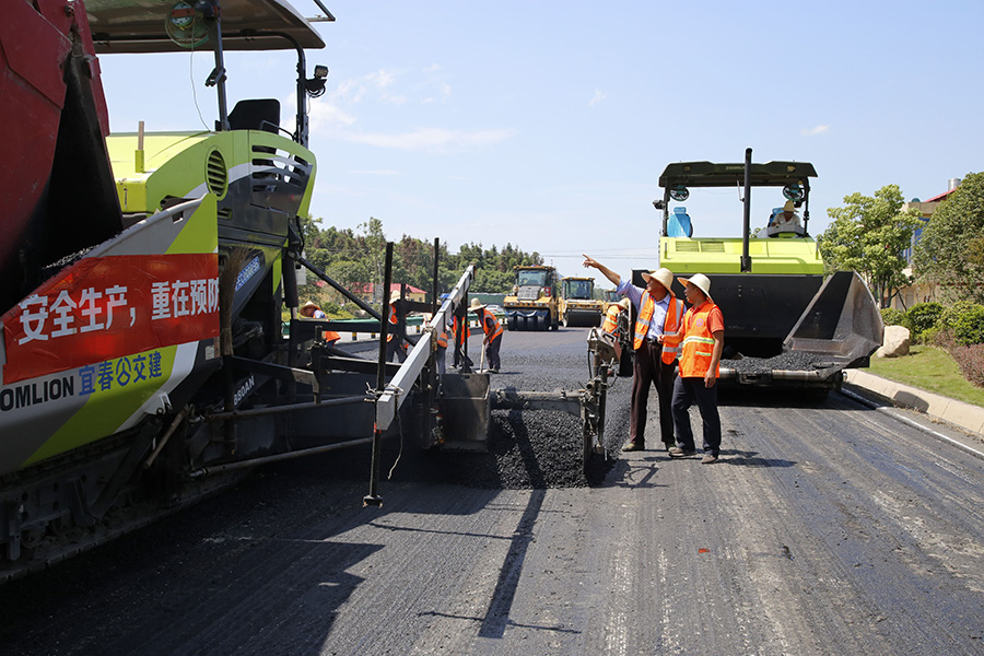 攤鋪機(jī)、壓路機(jī)等設(shè)備緊張有序運(yùn)行,高達(dá)170℃的瀝青混合料炙烤著公路人
